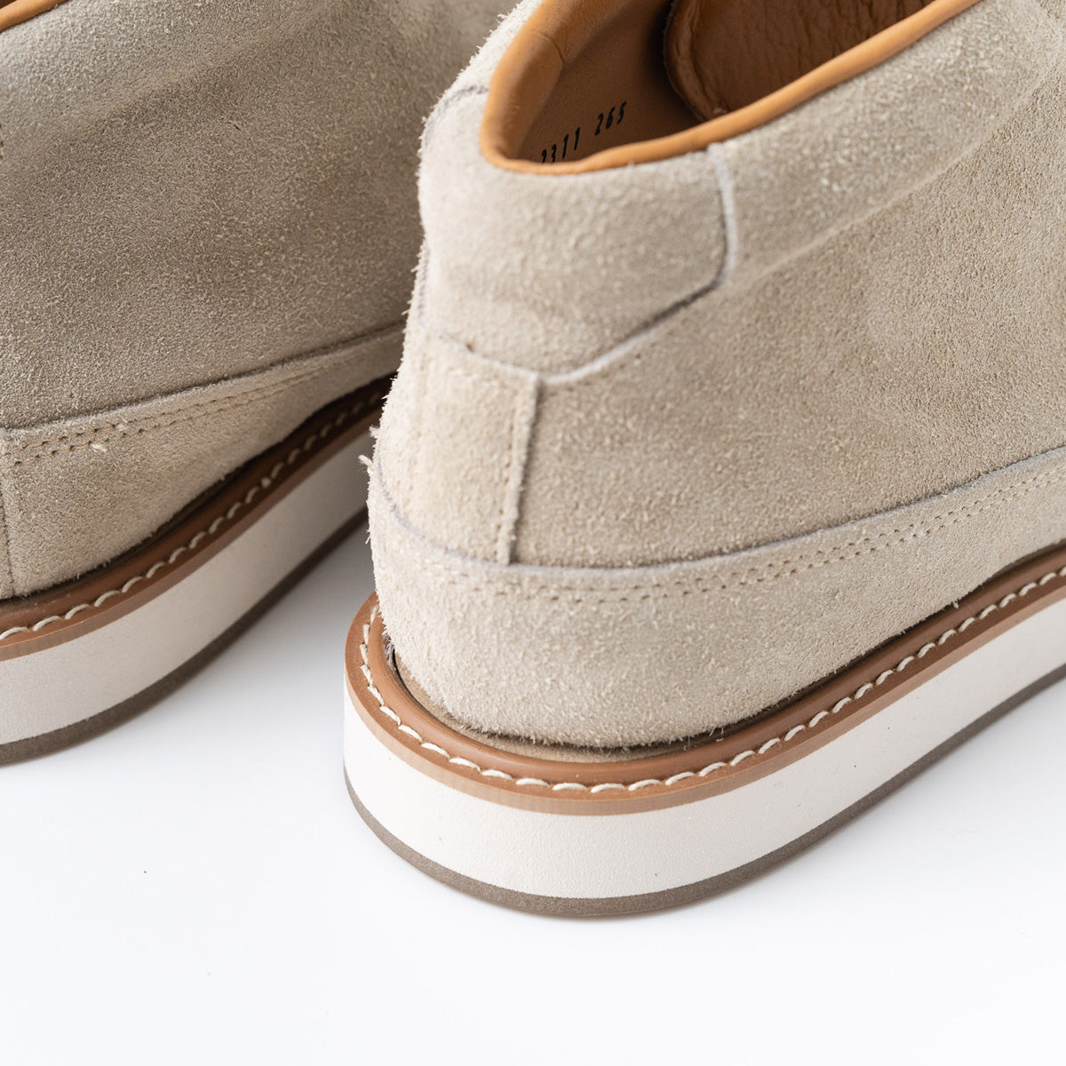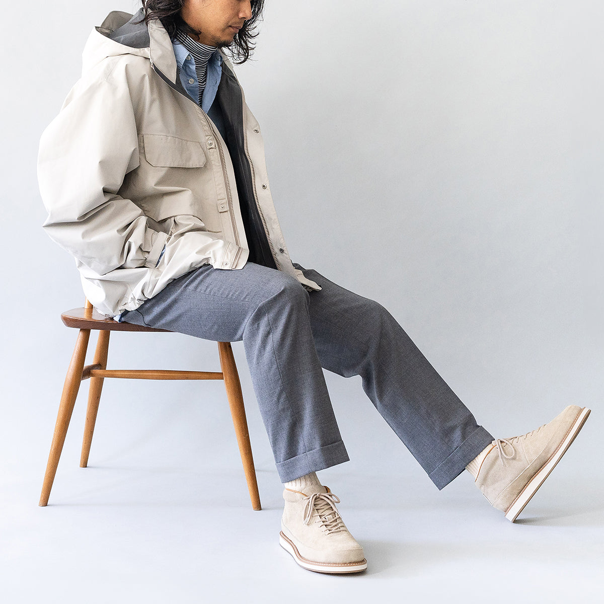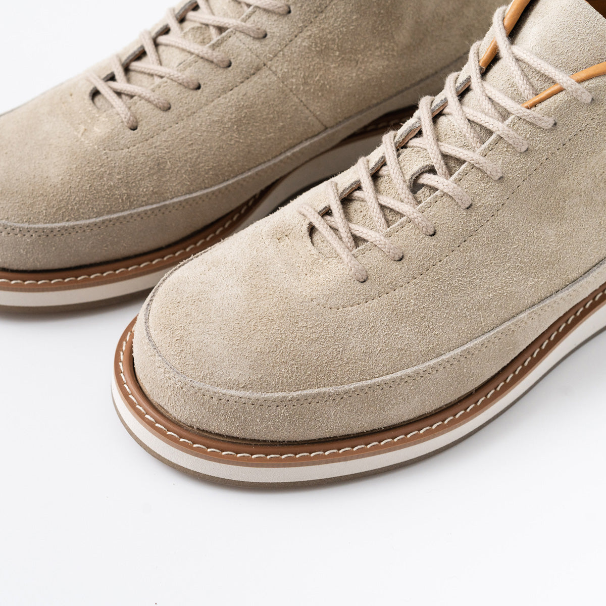 The upper design is simple and based on the motif of classic trekking shoes, while the upper material is made entirely of high-quality thick velour. The sole is equipped with an original unit sole with McKay specifications, making it a modernized model for town use.